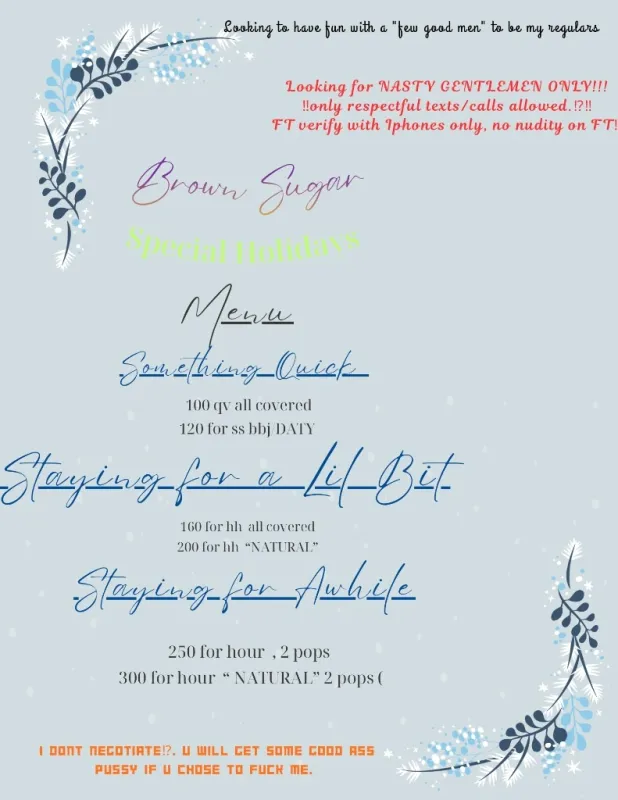Looking to have fun with a "few good men" to be my regulars 100% Real Body!! IM CLEAN AND DISEASE FREE!!!! Mature!!! No Games 💯 on the pics. Looking for NASTY GENTLEMEN ONLY!!! ‼only respectful texts/calls allowed.⁉‼ FT verify with Iphones only, no nudity on FT‼ 100qv 120ss bbj/DATY 160hh all covered.........200hh natural 250hr bbj covered kitty 2 pops.....300hr nathral I DONT NEGOTIATE⁉💋. U will get some good ass pussy if u chose to fuck me.